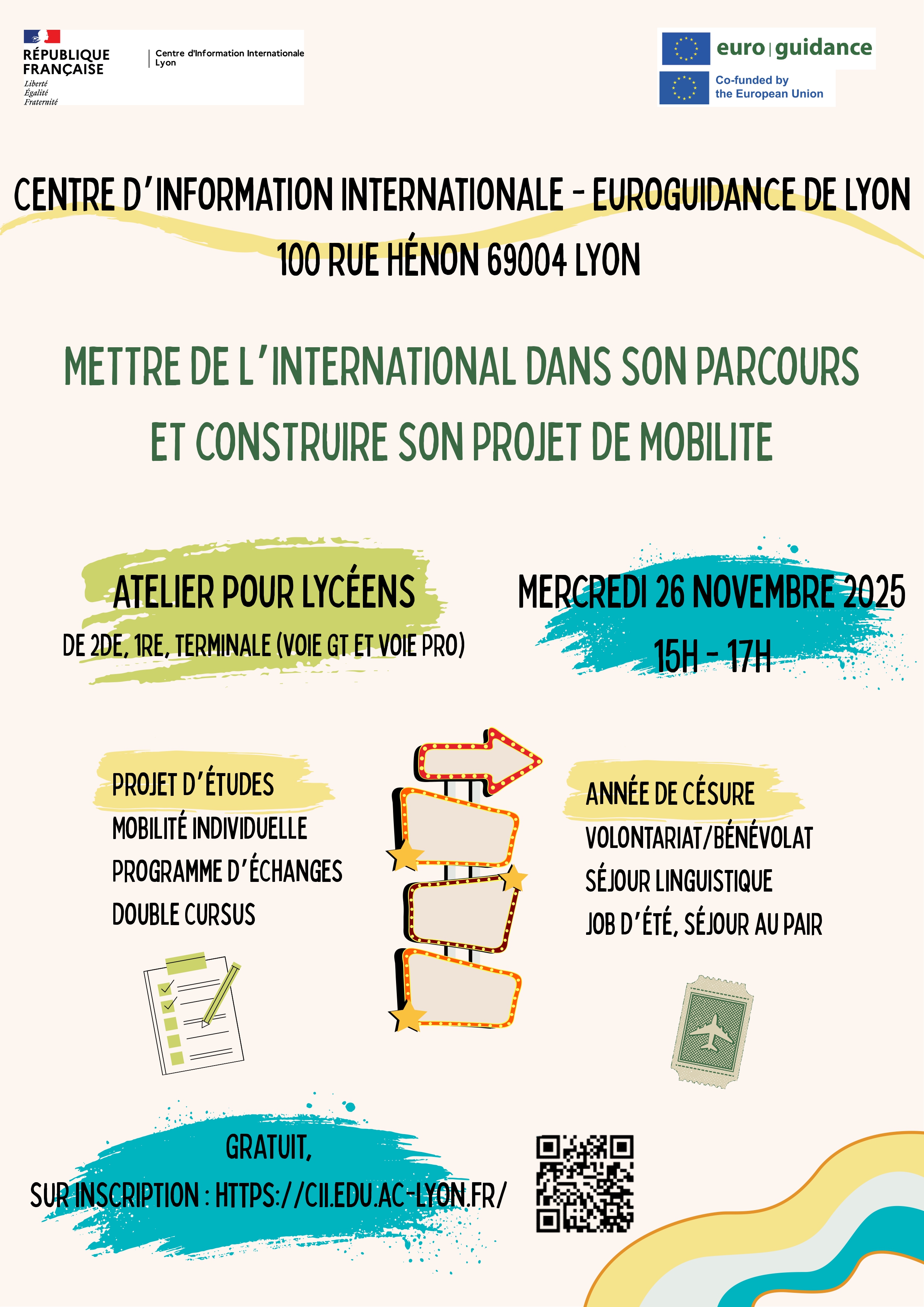 Le CII-Euroguidance organise un atelier à destination des lycéens de seconde, première et terminale : en présentiel le mercredi 26 novembre de 15h à 17h au CII-Euroguidance: INSCRIPTION OBLIGATOIRE sur https://cii.edu.ac-lyon.fr/spip/