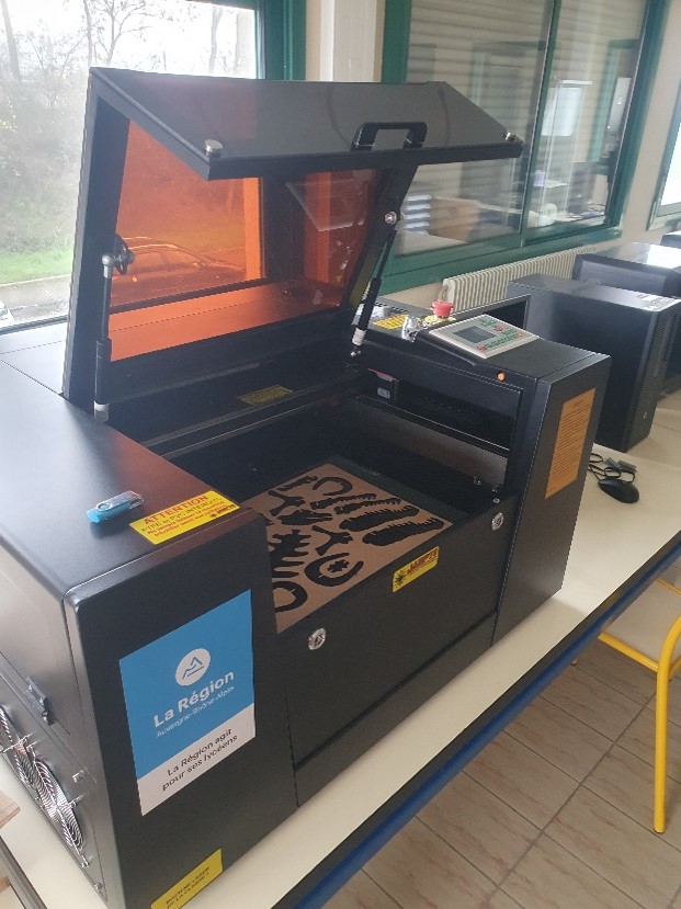 Découpeuse laser CO₂ : Outil puissant et précis, la découpeuse laser permet de graver et découper bois, carton, plexiglas et autres matériaux compatibles.