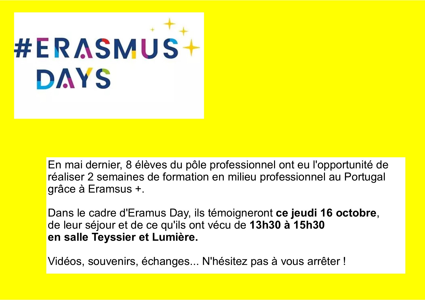 Des élèves ont eu l'opportunité de réaliser 2 semaines de formation en milieu professionnel au Portugal grâce à Eramsus +. Dans le cadre d'Eramus Day, ils témoigneront ce jeudi 16 octobre de 13h30 à 15h30, de leur séjour en salle Teyssier et Lumière